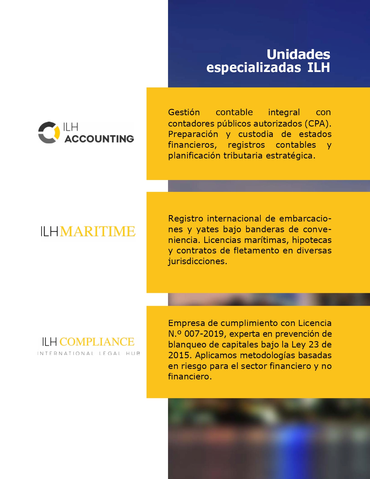 - Registro de buques y yates en BVI, Belice, Anguilla, Seychelles, Samoa, Marshall Islands, Bermuda, Islas Caimán, St. Kitts y Nevis, Chipre, Estados Unidos de América y Panamá.