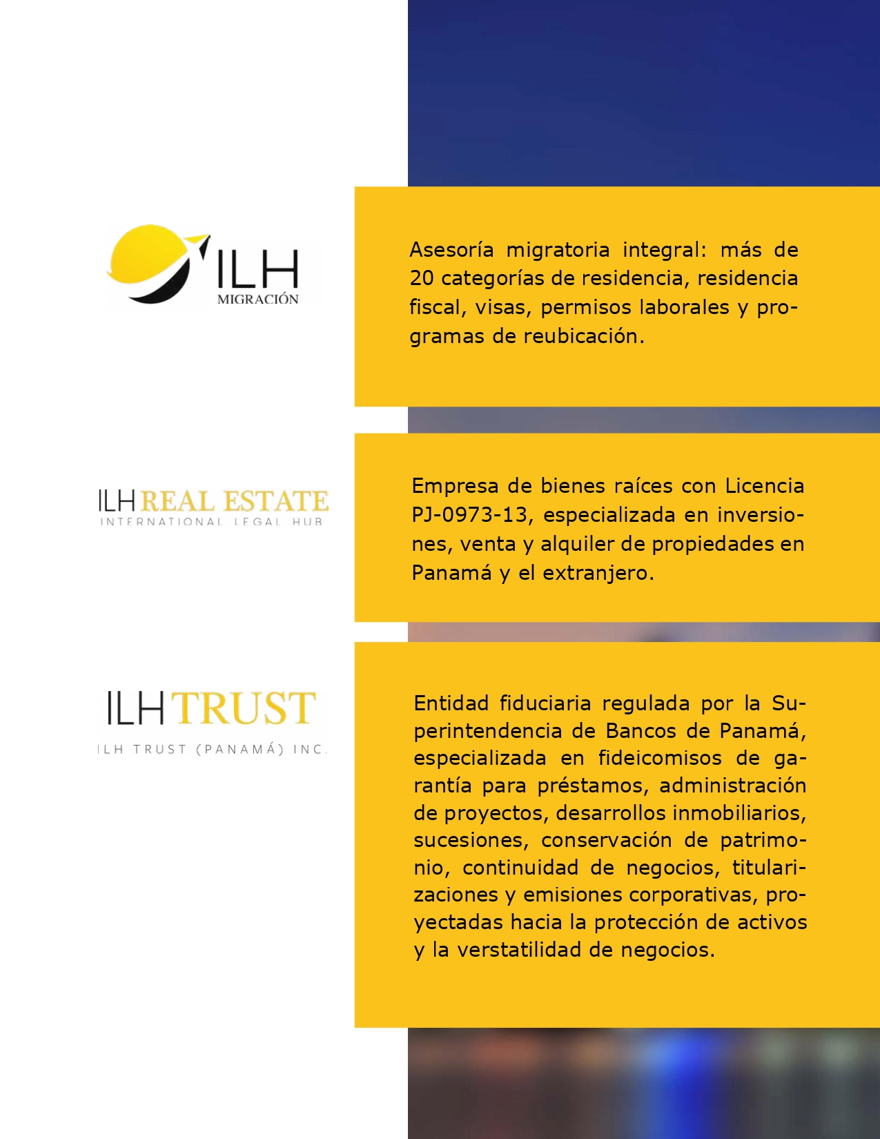 - Incorporación de sociedades en varias jurisdicciones como Belice, BVI, Anguilla, Costa Rica, Hong Kong, Singapur, Macao, Seychelles, Samoa, Chipre, Delaware, Florida, Nevada, Wyoming, New York, California, Panamá, Nueva Zelanda y Marshall Islands.